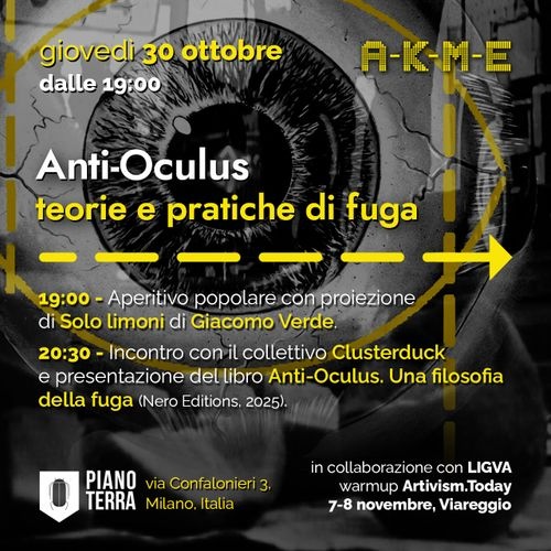 Anti-Oculus è un’incursione nei meccanismi della sorveglianza, un’indagine filosofica su come sfuggire ai dispositivi di controllo che regolano le nostre vite. Non offre scappatoie consolatorie ma segue con feroce ironia l’occhio del cyber-capitale, spingendoci a riunirci per andare in cerca di emancipazione, comunità e altre forme di vivere. Un saggio che si legge come un manifesto hacker, un pamphlet militante, un manuale di sabotaggio dall’interno, una guida per sparire dall’Oculus”. Acid Horizon, il collettivo che lo ha scritto, “è formato da artistз, musicistз e filosofз che nel 2020 ha dato vita a un omonimo podcast di filosofia e teoria culturale”. (https://www.neroeditions.com/product/anti-oculus/)