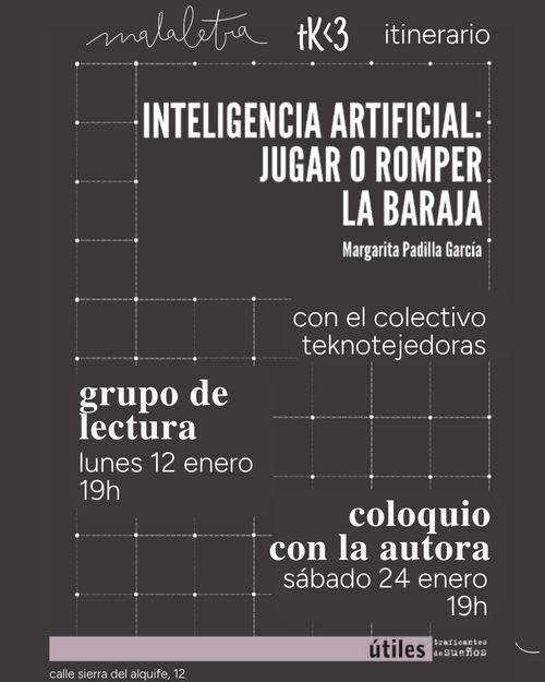 ✨ya vienen ya vienen las actividades para el 2026 (!!!) empezamos el curso con las compiis de teknotejedoras (🌸) para leer juntas el libro de margarita padilla sobre inteligencia artificial,,,, dos fechas para leer y debatir en torno a preguntas como: ¿qué sería una inteligencia artificial radical? O mejor dicho, ¿cómo sería una relación radical con la inteligencia artificial? ¿es posible acaso volver a sentir la alegría hacker por la potencia de actuar, de subvertir, de crear? ¿cómo hacerlo?✨apúntate aquí: https://forms.gle/AuxnCVVTDKRxdCsH8